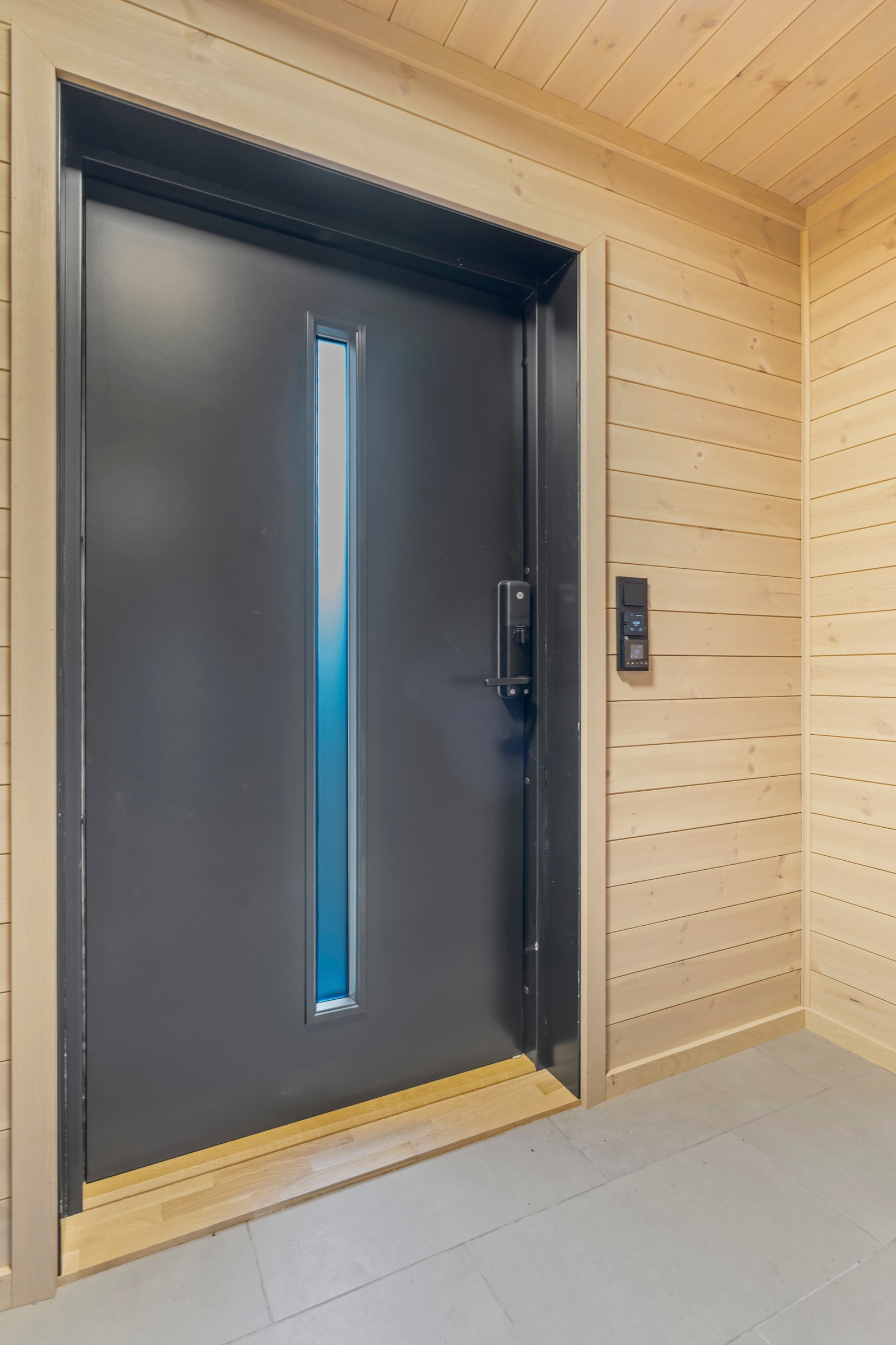 Inngangsdør Bygg1 Hovdeby og boddør Bygg1 . Dørblad, karm og foring malt svart. Terrassedør leveres i samme utførelse som vindu.
